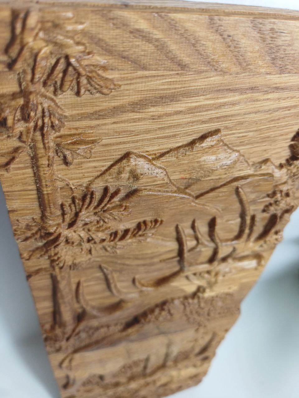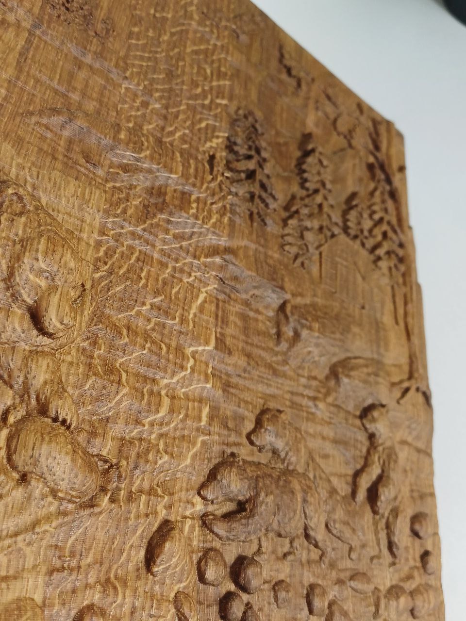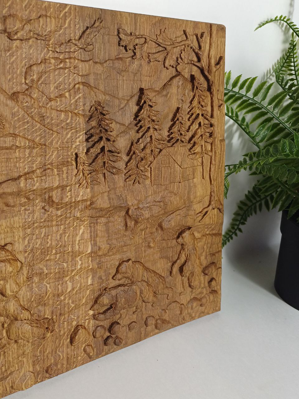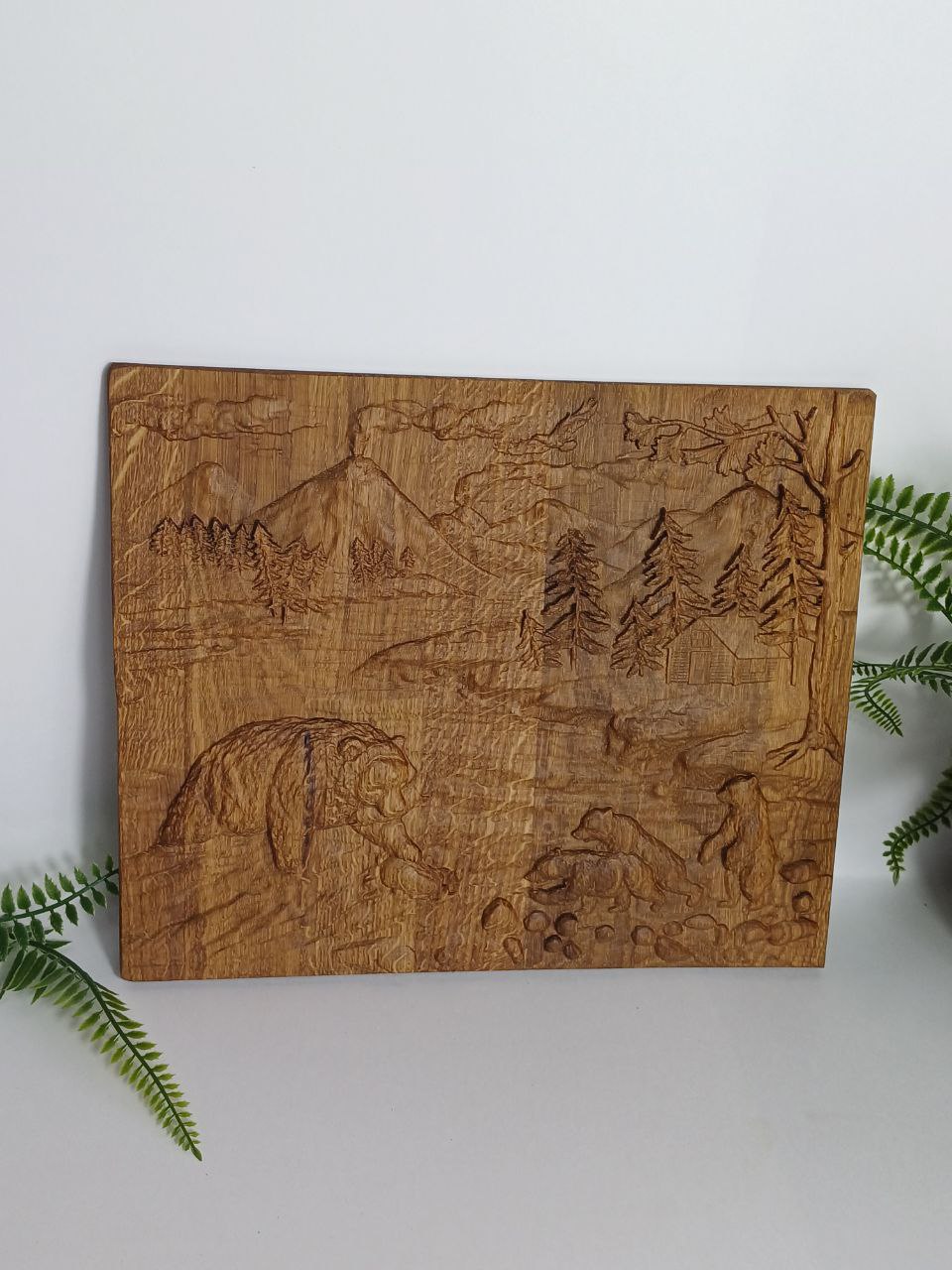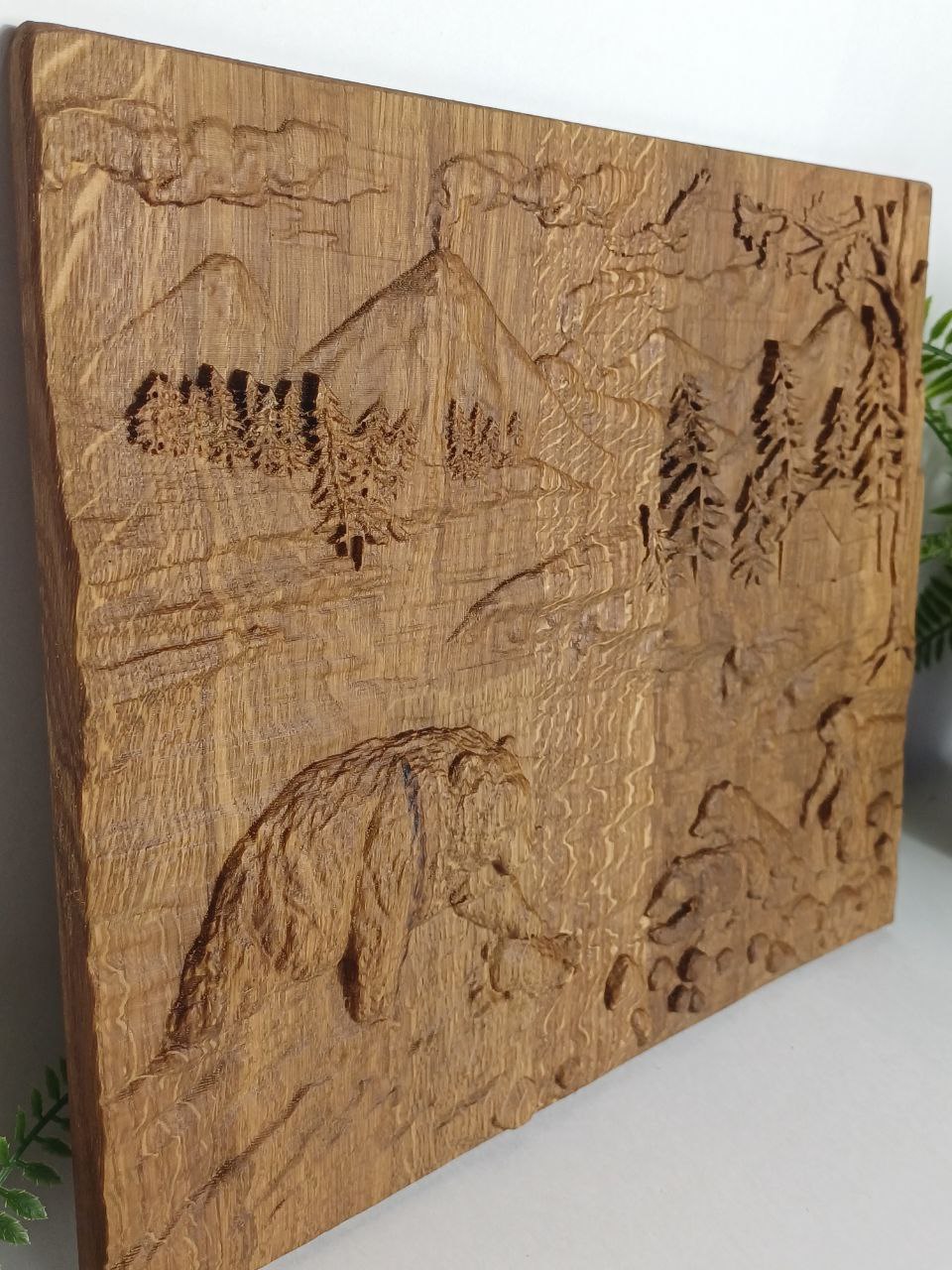Панно-картина "Медведица" 30х28 см резное из дуба, новое направление стиля в интерьере. тренд текущего года - натуральное дерево, теплый оттенок настоящего дуба с фрагментом природы гор.