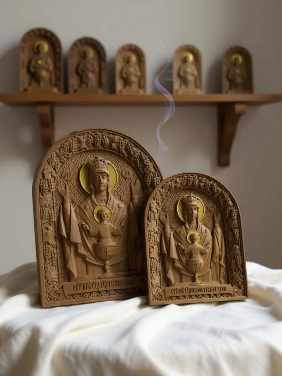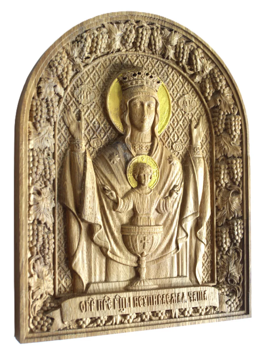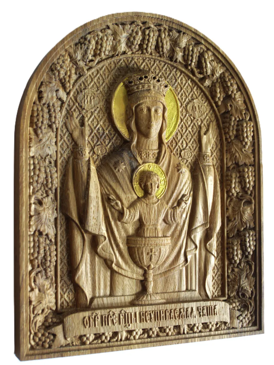 Освященная Икона Божией Матери "Неупиваемая Чаша" резная из массива дуба представлена в 2х вариантах размеров, выбирайте нужный Вам размер в карточках.