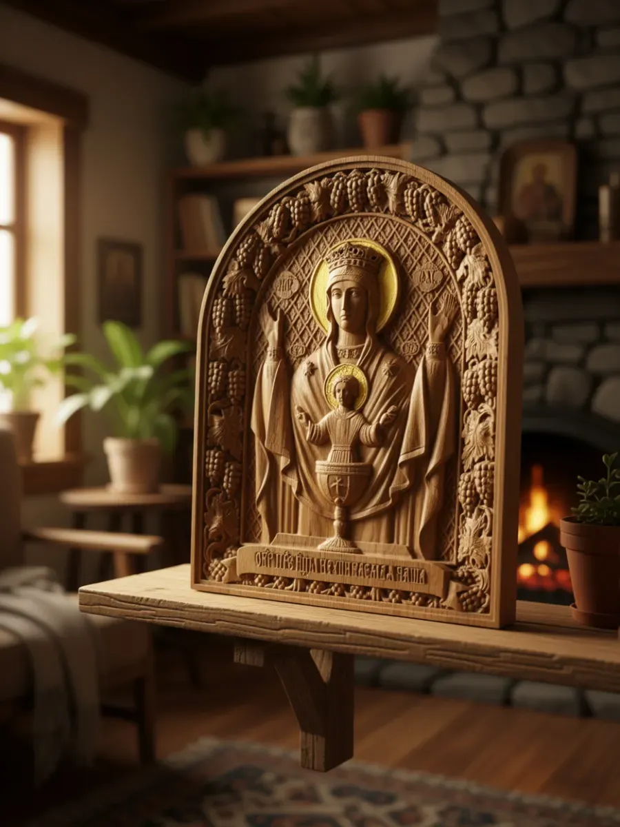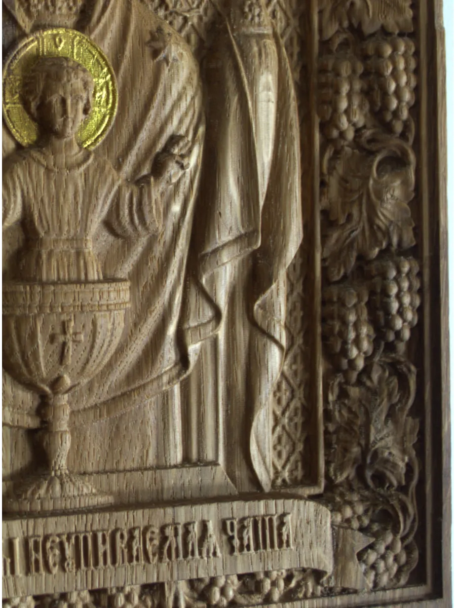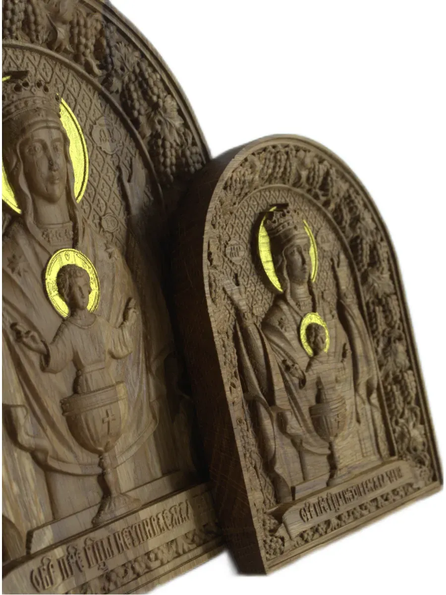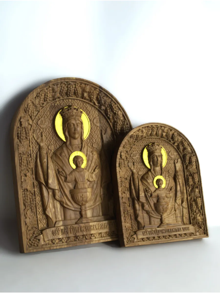 Освященная Икона Божией Матери "Неупиваемая Чаша" резная из массива дуба представлена в 2х вариантах размеров, выбирайте нужный Вам размер в карточках.