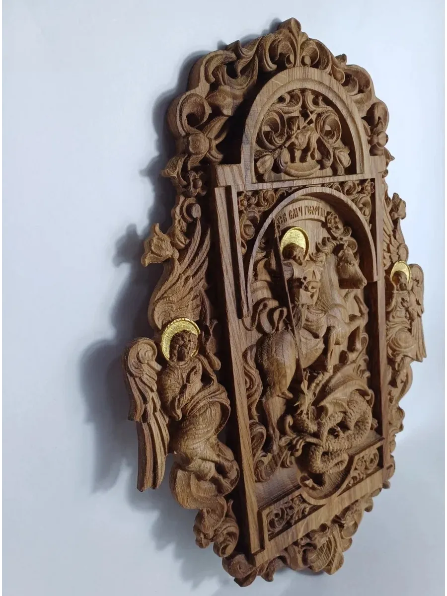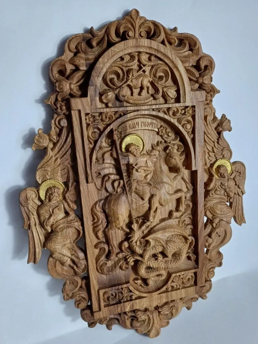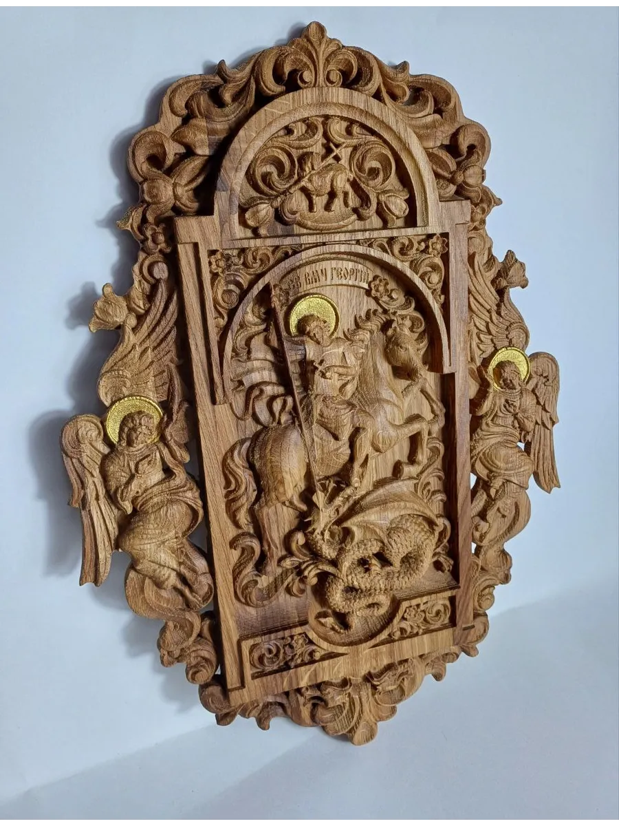 Освященная икона Георгия Победоносца станет прекрасным украшением вашего дома и символом защиты. Изображение святого Георгия, выполненное с любовью и мастерством, обрамлено в изысканную резную раму с изображением ангелов, что придает иконе особую торжественность и красоту. Размер иконы 39х28 см, что позволяет ей гармонично вписаться в интерьер любой комнаты. Изготовленная из натурального дуба, икона обладает теплым и благородным оттенком, создавая атмосферу уюта и спокойствия. Освященная икона Георгия Победоносца станет не только украшением вашего дома, но и источником духовной силы и защиты.