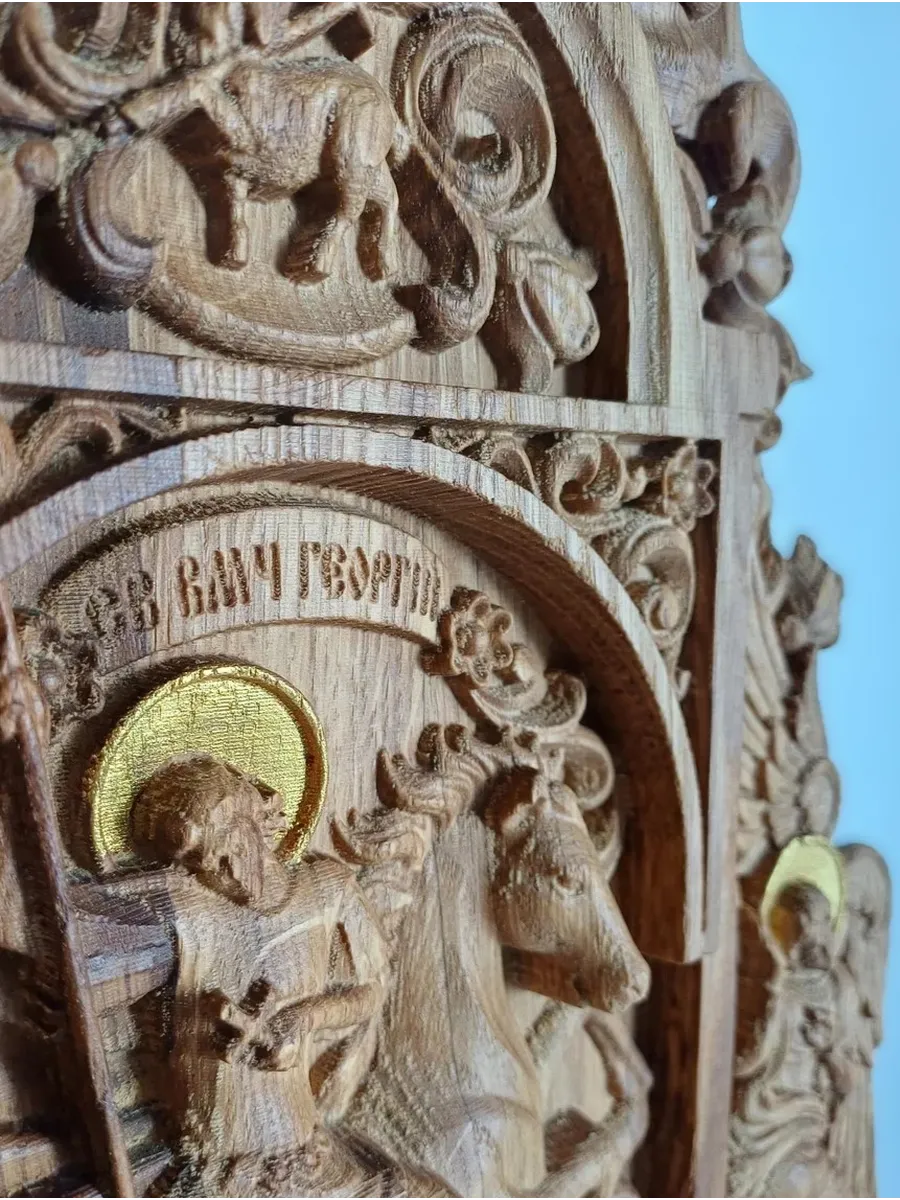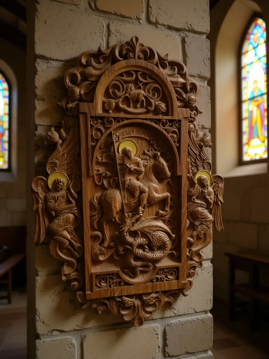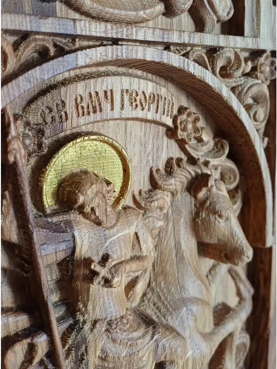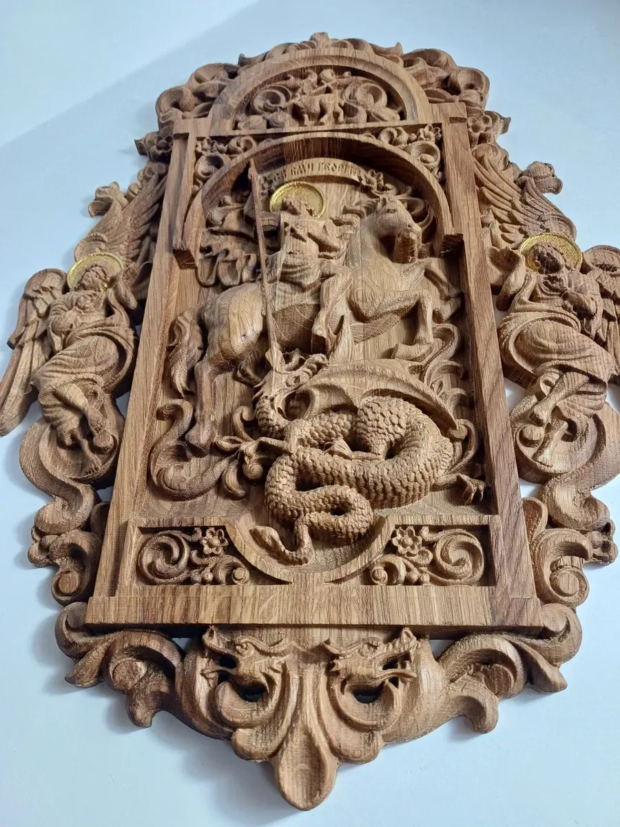 Освященная икона Георгия Победоносца станет прекрасным украшением вашего дома и символом защиты. Изображение святого Георгия, выполненное с любовью и мастерством, обрамлено в изысканную резную раму с изображением ангелов, что придает иконе особую торжественность и красоту. Размер иконы 39х28 см, что позволяет ей гармонично вписаться в интерьер любой комнаты. Изготовленная из натурального дуба, икона обладает теплым и благородным оттенком, создавая атмосферу уюта и спокойствия. Освященная икона Георгия Победоносца станет не только украшением вашего дома, но и источником духовной силы и защиты.