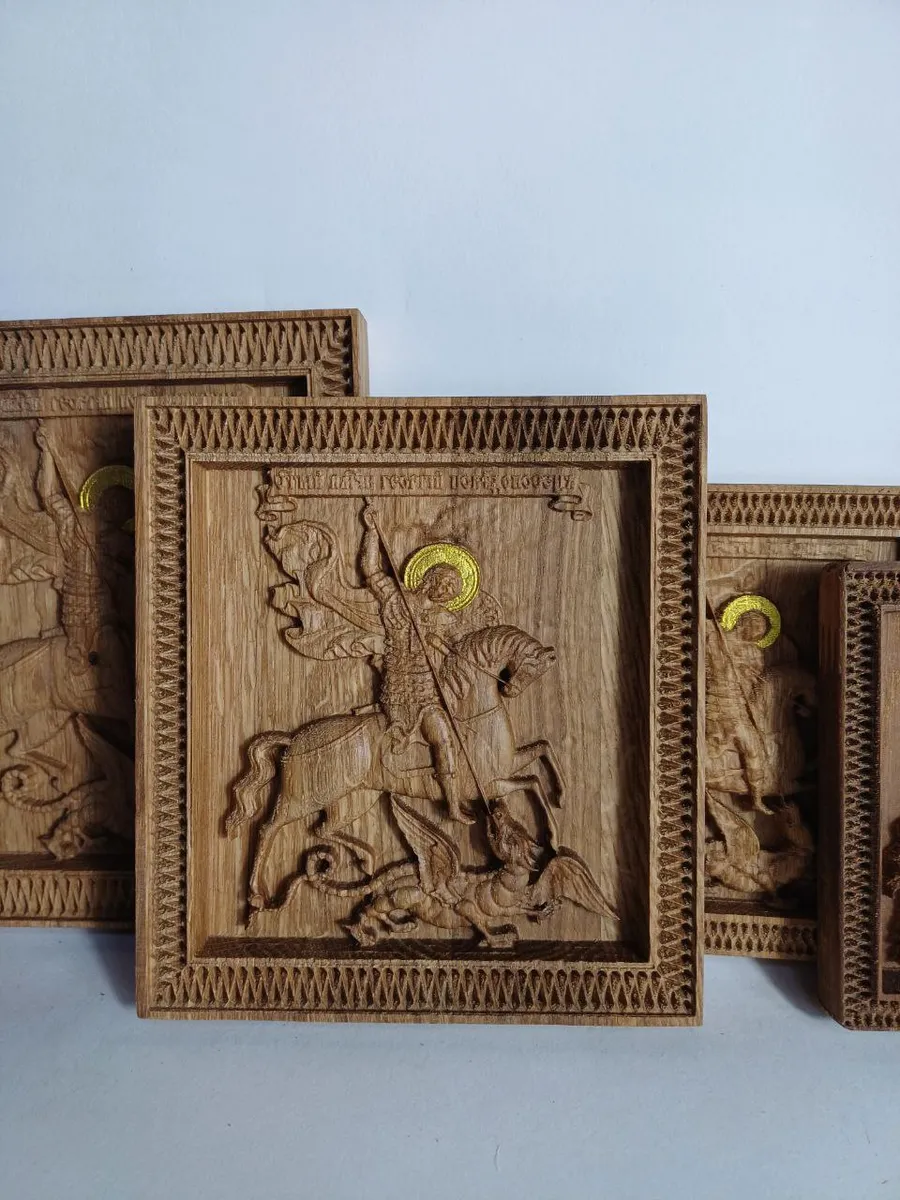 Освященная икона Святого Георгия Победоносца, вырезанная из массива дуба, станет прекрасным украшением вашего дома и символом защиты. Икона, выполненная в традиционной технике резьбы по дереву, поражает своей детализацией и глубиной проработки. Ее благородный дубовый цвет придает ей особую теплоту и уют. Размер иконы 14,5х15,5 см, что позволяет ей гармонично вписаться в любой интерьер. Освященная икона станет не только украшением, но и источником духовной силы и умиротворения.