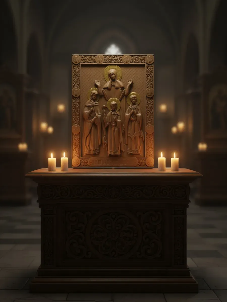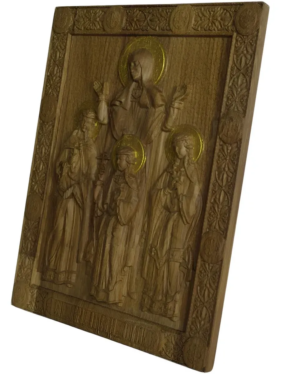 Освященная икона святых мучениц Веры, Надежды, Любови и матери их Софии станет прекрасным украшением вашего дома и источником духовной силы. Резная из массива дуба, икона отличается изысканным исполнением и благородным цветом дерева. Ее размер 18.9x24.3 см делает ее подходящей для размещения на полке, тумбочке или стене. Эта освященная икона станет прекрасным подарком для близких людей, помогая им ощутить присутствие святых в своем доме.