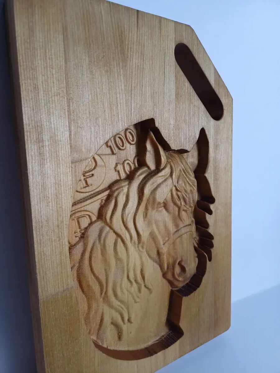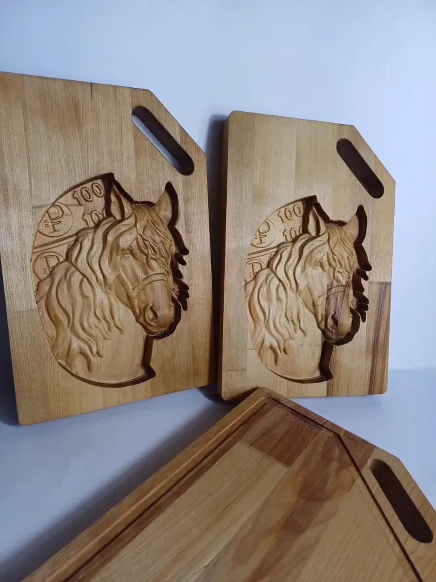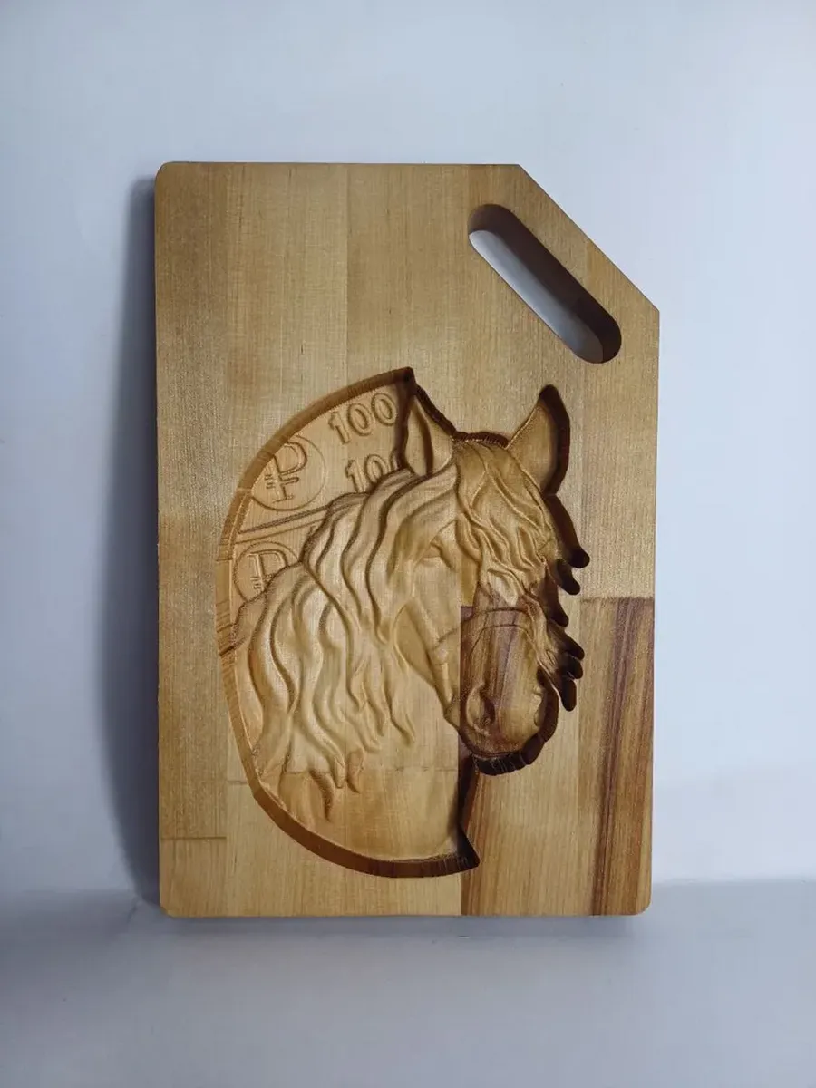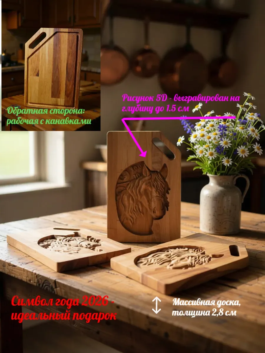 Разделочная доска Денежная Лошадь 28,5см х19 см выполненная из массива березы с выгравированным глубоким рисунком 3D Лошади (Символ 2026 года) с одной стороны, и рабочей поверхностью с канавками по периметру - с другой стороны, станет отличным подарком на Новогодние, семейные и любые другие традиционные праздники в Вашем кругу. Такой подарок приведет в восторг одаряемого и будет полезен в быту долгие годы.