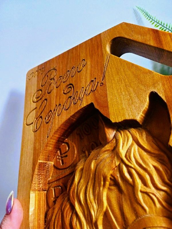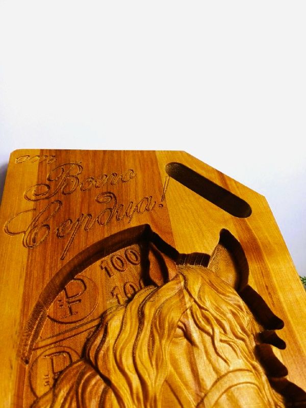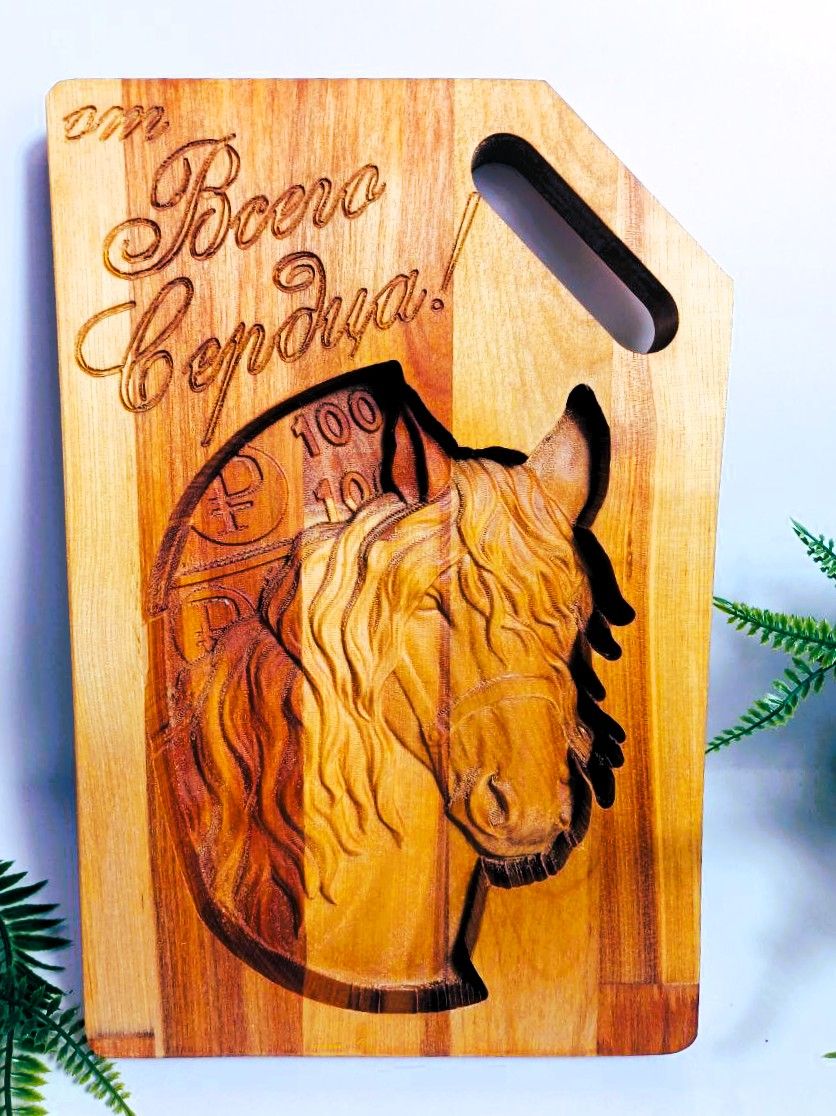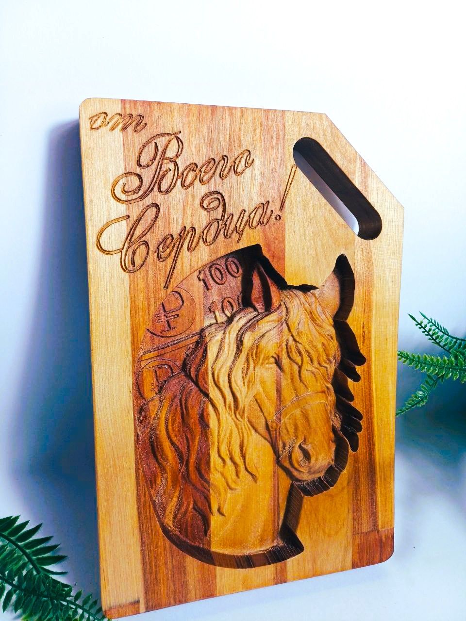 Разделочная доска подарочная с гравировкой "От Всего Сердца" 28,5см х19 см выполненная из массива березы с вырезным глубоким рисунком 3D Лошади с одной стороны, (Символ верности, благородства, силы, олицетворение внутренней энергии) и рабочей поверхностью с канавками по периметру - с другой стороны, станет отличным уникальным подарком на любой праздник и по любому поводу, будь то 8 Марта, День матери, День Рождения, Юбилей, Новоселье, Такой подарок приведет в восторг одаряемого и будет полезен в быту долгие годы.
